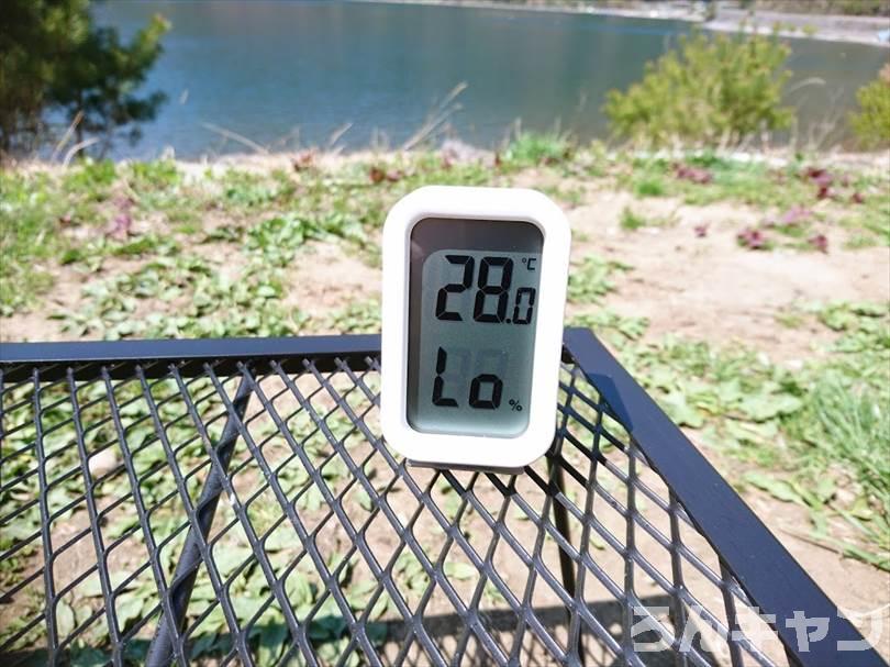 無印良品の『デジタル温湿度計』を屋外(テントの外)でメッシュテーブルの上に置いてみました。