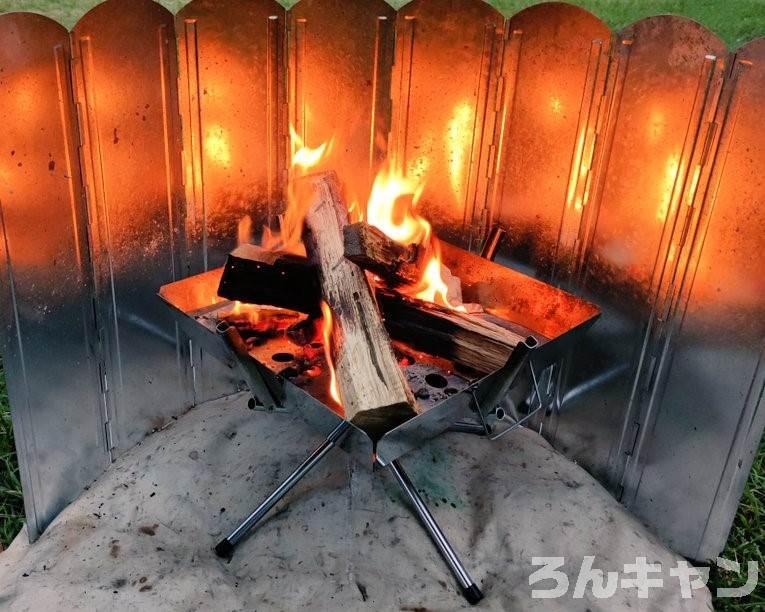 キャンプグリーブの大型反射板・風防板(幅120cm×高さ60cm)を使えば焚き火が快適に楽しくなります。