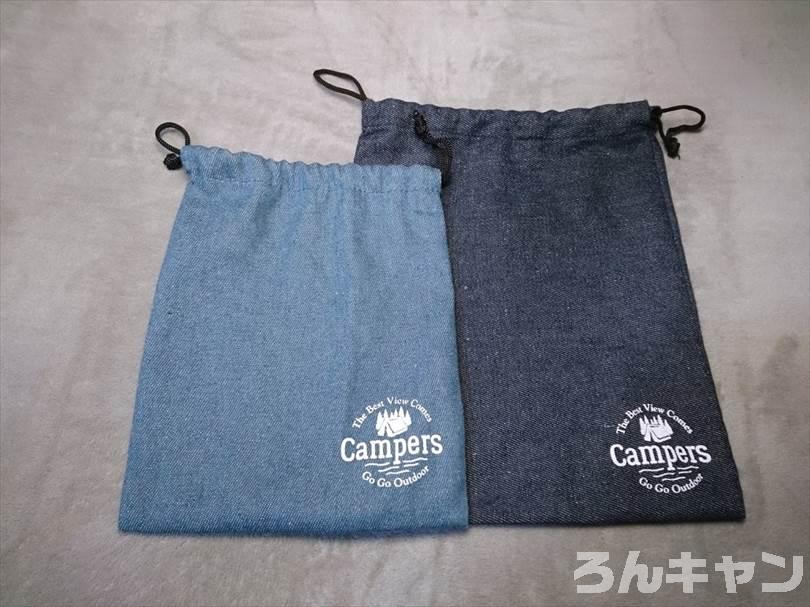 【100均】ダイソーのデニム巾着が大小2サイズで使いやすい|キャンプのロゴも可愛い