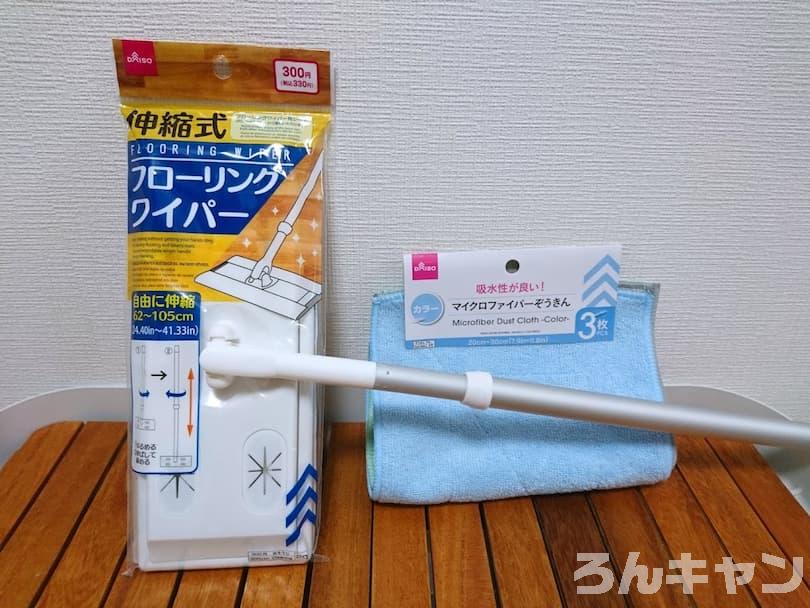 【100均】ダイソーの伸縮式フローリングワイパー&マイクロファイバーぞうきん|結露や夜露で濡れたテントを拭く