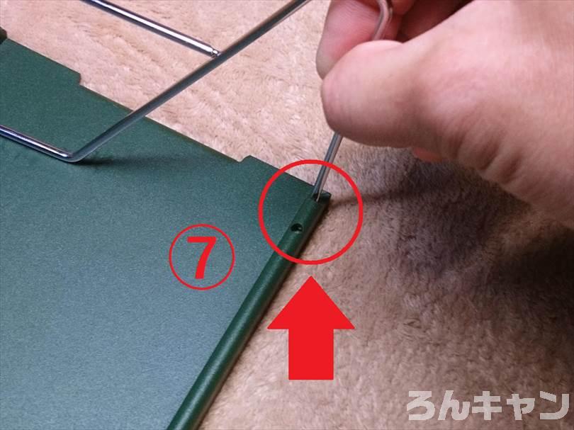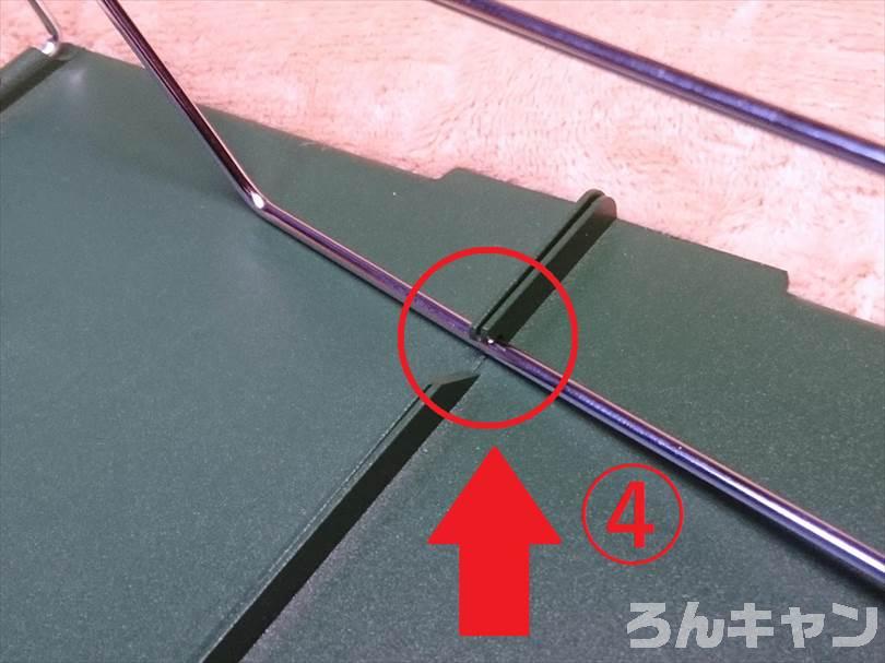 上の写真の赤丸にある「爪」にフレームをひっかけます(2回目・中央の天板の右側の爪)。